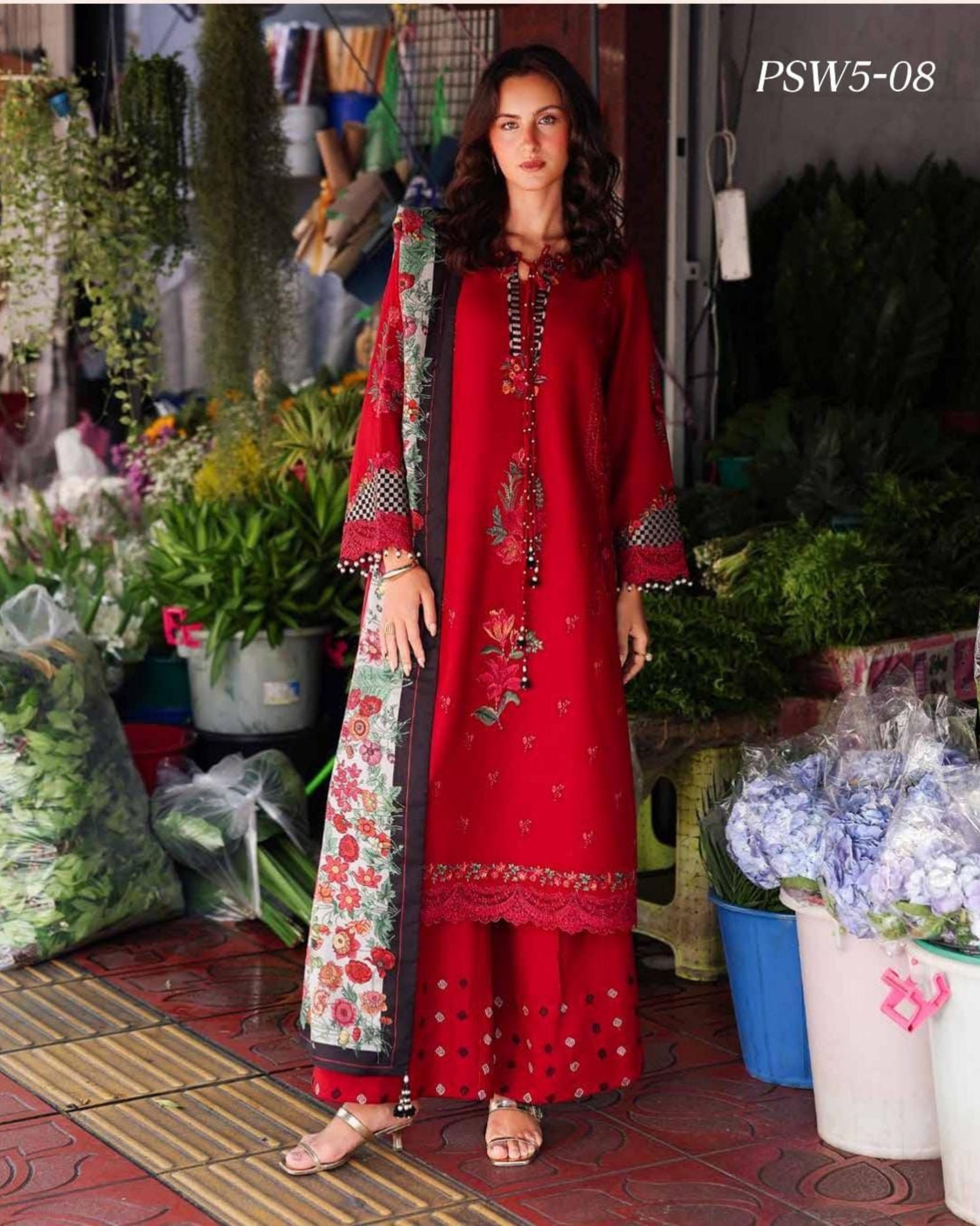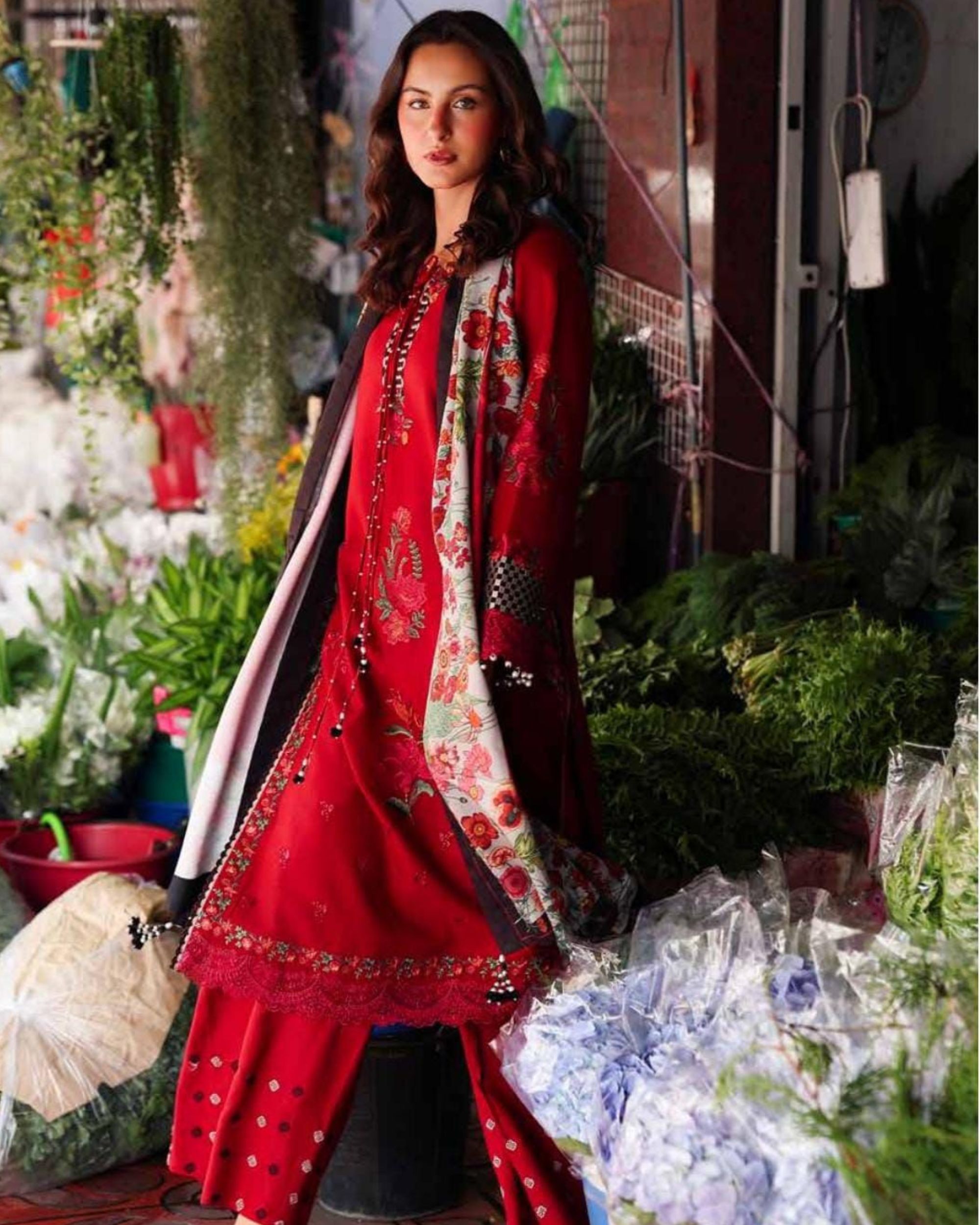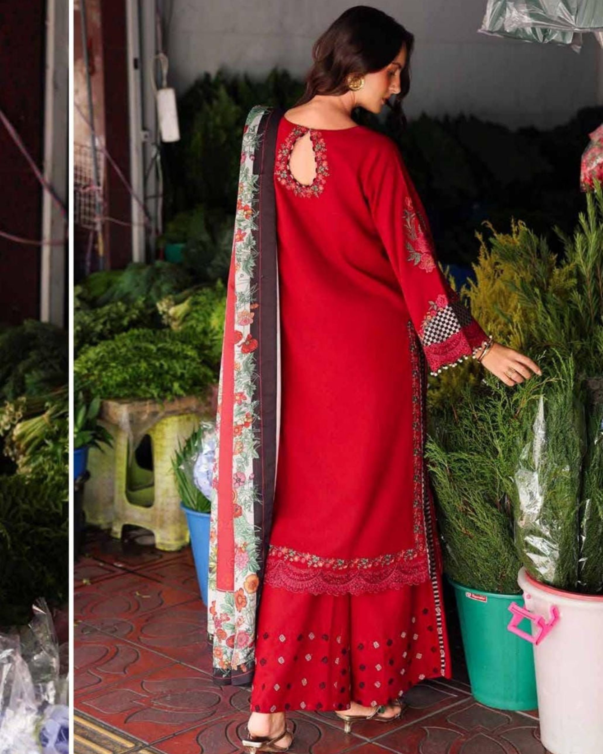 Luxury Charizma Posheema 2025 unstitched peach leather suit featuring embroidered printed staple front, back, sleeves, trouser, and a beautifully printed staple shawl with 8-meter embroidered patti. Perfect winter premium wear — Retail 8500 → Now 7800.