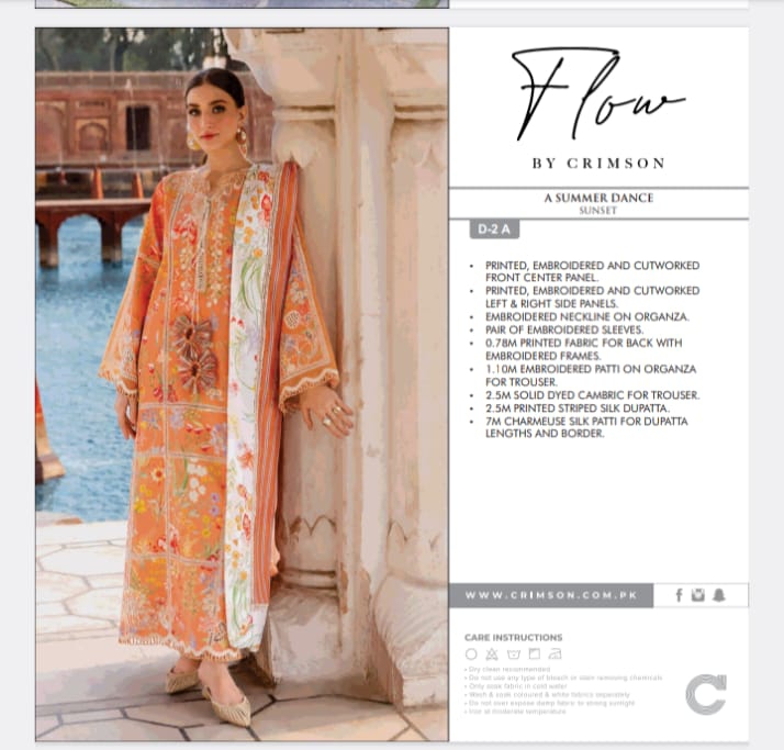 Brighten your summer wardrobe with this elegant Crimson Flow 3-piece suit in a refreshing sunset orange tone. The outfit features a beautifully printed and embroidered shirt with delicate cutwork details, paired with an organza embroidered neckline and sleeves for a graceful look. It comes with a soft printed striped silk dupatta and a comfortable cambric trouser, making it perfect for festive gatherings and summer events. Stylish, lightweight, and effortlessly classy.