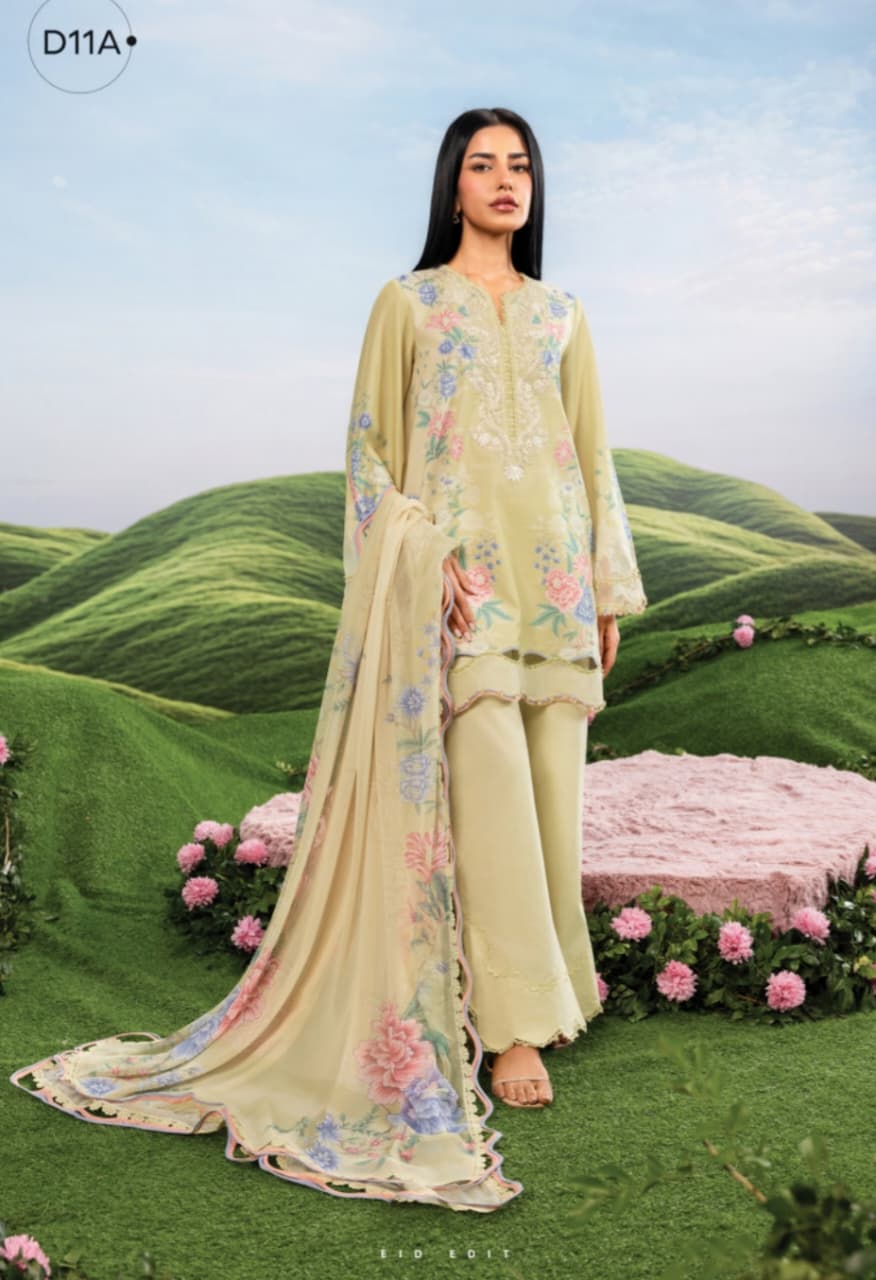 A graceful pastel ensemble featuring delicate floral embroidery on a soft light yellow shirt, paired with matching trousers and a beautifully printed chiffon dupatta. Perfect for a fresh, feminine look this season.